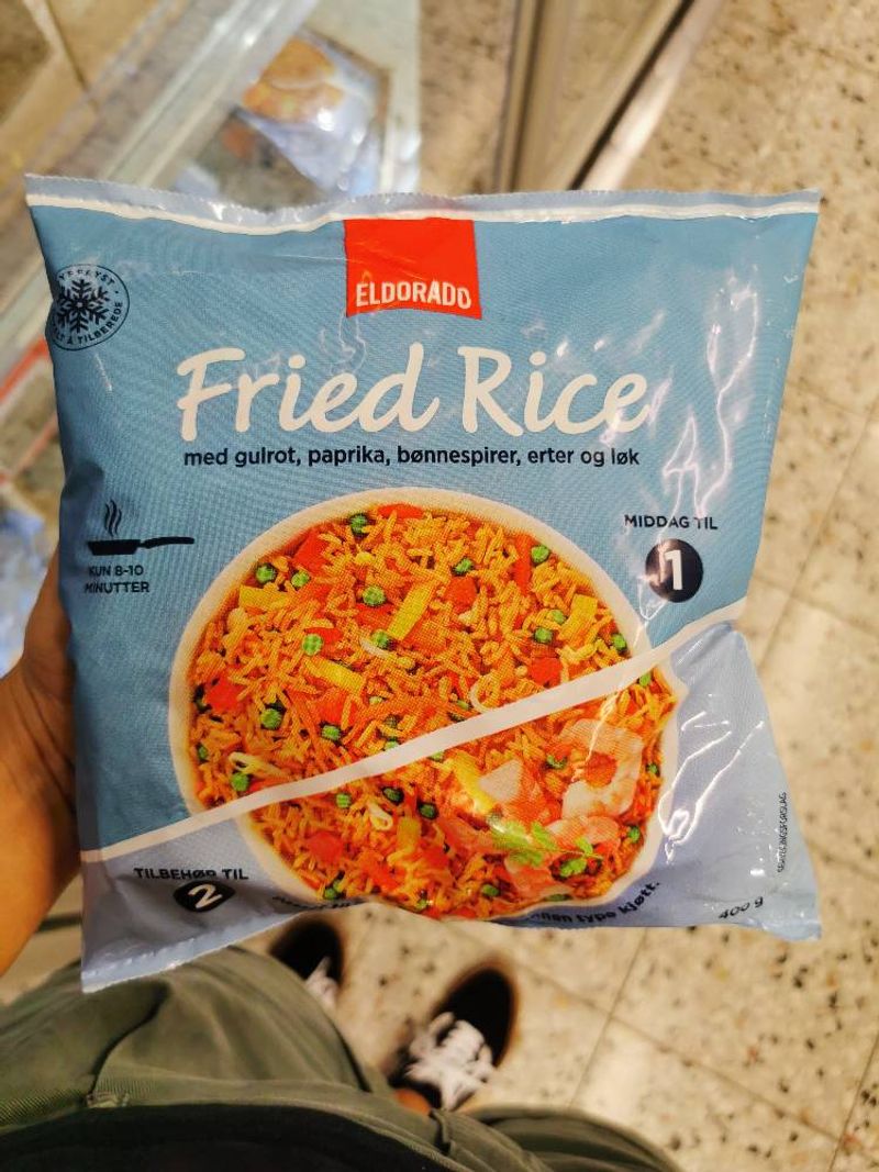 Fried rice med gulrot, paprika, bønnespirer, erter og løk